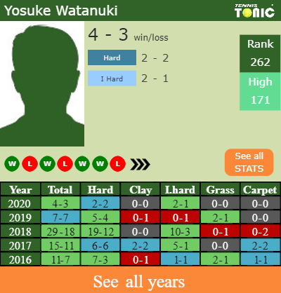 Watanuki has a 4-3 win-loss record in 2020, 2-1 on indoor hard courts (See FULL STATS).