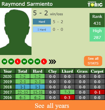 Sarmiento has a 5-2 win-loss record in 2020, 0-0 on indoor hard courts (See FULL STATS).