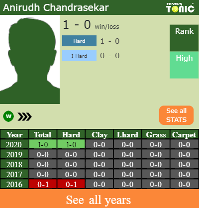 Anirudh has a 1-0 win-loss record in 2020, 1-0 on hard (See FULL STATS).