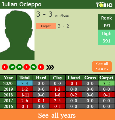 Ocleppo has a 3-3 win-loss record in 2020, 0-0 on hard (See FULL STATS).