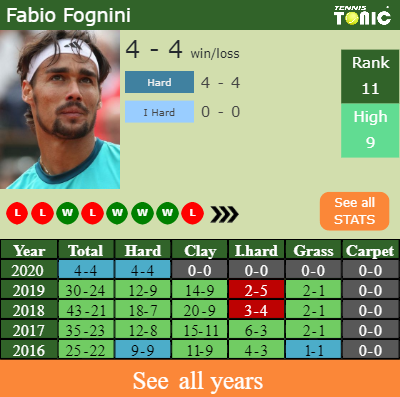 Fognini has a 4-4 win-loss record in 2020, 0-0 on indoor hard courts (See FULL STATS).