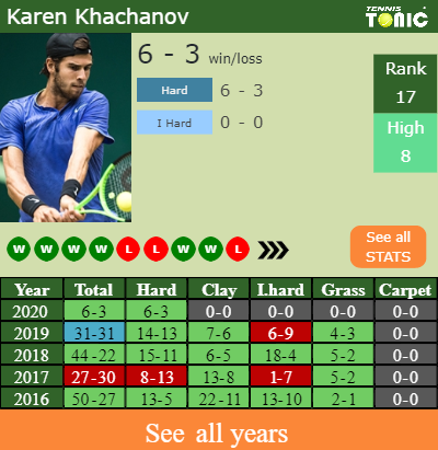 Khachanov has a 6-3 win-loss record in 2020, 0-0 on indoor hard courts (See FULL STATS).