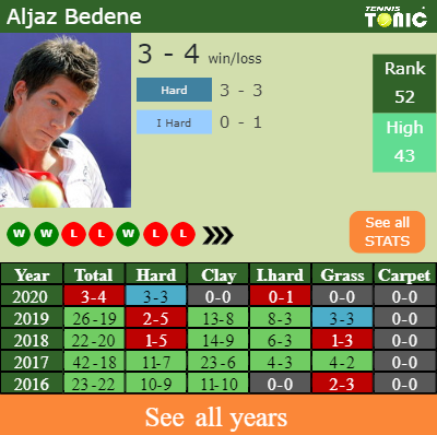 Bedene has a 3-4 win-loss record in 2020, 0-1 on indoor hard courts (See FULL STATS).