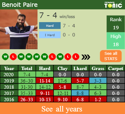 The French Player has a 7-4 win-loss record in 2020, 0-0 on indoor hard courts (See FULL STATS).