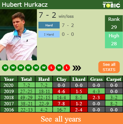 Hubert has a 7-2 win-loss record in 2020, 0-0 on indoor hard courts (See FULL STATS).