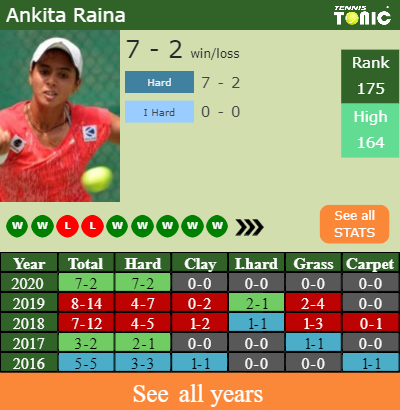 Ankita has a 7-2 win-loss record in 2020, 7-2 on hard (See FULL STATS).