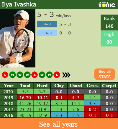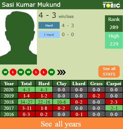 The Indian has a 4-3 win-loss record in 2020, 4-3 on hard (See FULL STATS).