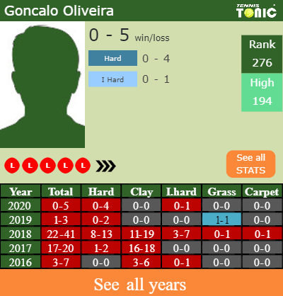 Oliveira has a 0-5 win-loss record in 2020, 0-1 on indoor hard courts (See FULL STATS).