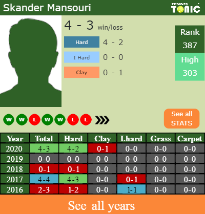 Skander has a 4-3 win-loss record in 2020, 0-0 on indoor hard courts (See FULL STATS).