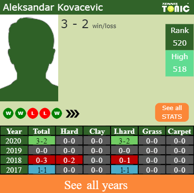 Kovacevic has a winning win-loss record in the last 4 years having won 54% of his matches (13-11). 3-2 on indoor hard courts in 2020. Regarding his performance on the same surface of this competition, Kovacevic has a 4-6 win-loss record in the last 4 years on indoor hard courts.