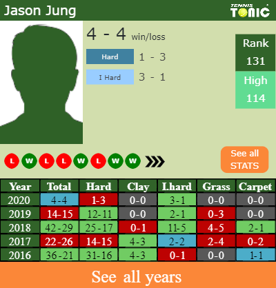 Jung has a 4-4 win-loss record in 2020, 3-1 on indoor hard courts (See FULL STATS).