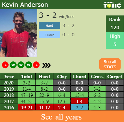 The South African has a 3-2 win-loss record in 2020, 0-0 on indoor hard courts (See FULL STATS).