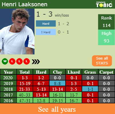 Laaksonen has a 1-3 win-loss record in 2020, 0-1 on indoor hard courts (See FULL STATS).