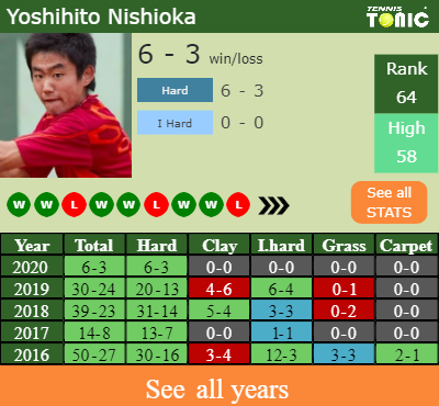 Yoshihito has a 6-3 win-loss record in 2020, 0-0 on indoor hard courts (See FULL STATS).