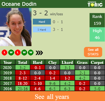Dodin has a winning record in the last 9 years having won 58% of her matches (100-73). 3-1 on indoor hard courts in 2020. Talking about her performance on the same surface of this tournament, Dodin has a 59-71 record in the last 9 years on indoor hard courts.