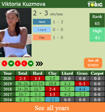 Viktoria has a 2-3 win-loss record in 2020, 0-0 on indoor hard courts (See FULL STATS).
