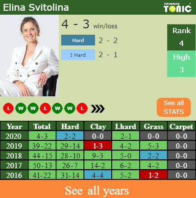 The Ukrainian has a 4-3 win-loss record in 2020, 2-2 on hard (See FULL STATS).