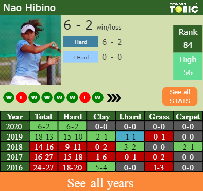 Hibino has a 6-2 win-loss record in 2020, 6-2 on hard (See FULL STATS).