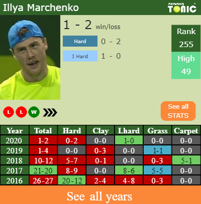 Illya has a 1-2 win-loss record in 2020, 1-0 on indoor hard courts (See FULL STATS).