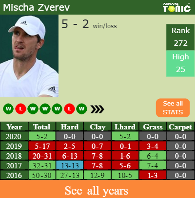 Zverev has a 5-2 win-loss record in 2020, 5-2 on indoor hard courts (See FULL STATS).