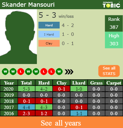 Mansouri has a solid win-loss record in the last 6 years having won 62% of his matches (8-5). 1-0 on indoor hard courts in 2020. Regarding his performance on the same surface of this tournament, Mansouri has a 12-12 win-loss record in the last 6 years on indoor hard courts.
