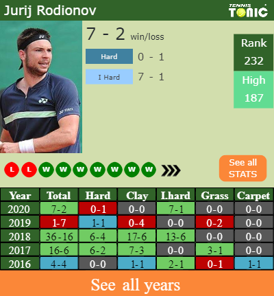Rodionov has a fantastic record in the last 5 years having won 76% of his matches (76-24). 7-1 on indoor hard courts in 2020. In connection with his performance on the same surface of this event, Rodionov has a 64-35 record in the last 5 years on indoor hard courts.