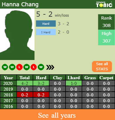 Chang has a fantastic record in the last 5 years having won 100% of her matches (5-0). 1-0 on indoor hard courts in 2020. Regarding her performance on the same surface of this tournament, Chang has a 4-4 win-loss record in the last 5 years on indoor hard courts.