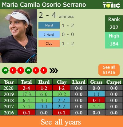 Camila Osorio Serrano has a 2-4 win-loss record in 2020, 0-0 on indoor hard courts (See FULL STATS).