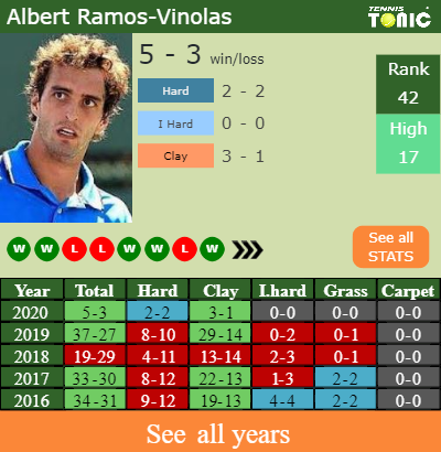 Ramos has a solid win-loss record in the last 10 years having won 63% of his matches (1181-700). 3-1 on clay in 2020. In connection with his performance on the same surface of this tournament, Ramos has a 338-273 win-loss record in the last 10 years on clay.
