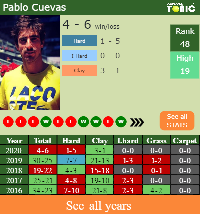 Cuevas has a solid win-loss record in the last 10 years having won 65% of his matches (931-504). 3-1 on clay in 2020. In connection with his performance on the same surface of this competition, Cuevas has a 217-160 win-loss record in the last 10 years on clay.
