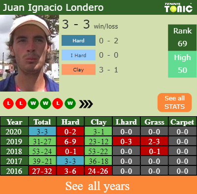 Londero has a solid win-loss record in the last 9 years having won 63% of his matches (1127-661). 3-1 on clay in 2020. In connection with his performance on the same surface of this tournament, Londero has a 234-171 win-loss record in the last 9 years on clay.