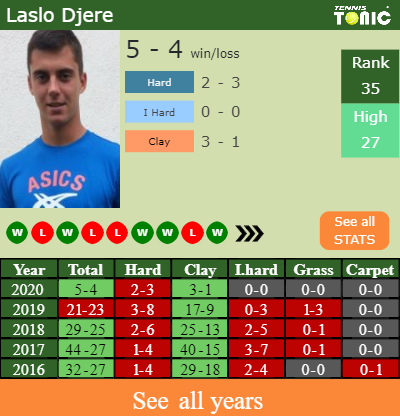 Laslo has a 5-4 win-loss record in 2020, 3-1 on clay (See FULL STATS).