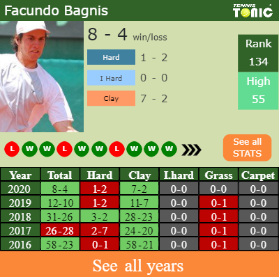 Bagnis has a solid win-loss record in the last 10 years having won 62% of his matches (1443-879). 7-2 on clay in 2020. Regarding his performance on the same surface of this tournament, Bagnis has a 317-221 win-loss record in the last 10 years on clay.