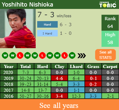 Nishioka has a 7-3 win-loss record in 2020, 1-0 on indoor hard courts (See FULL STATS).