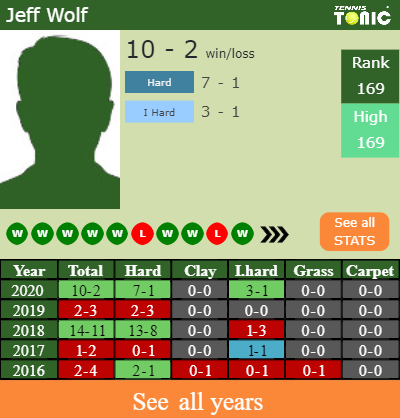 Wolf has a unfavourable win-loss record in the last 6 years having won 48% of his matches (25-23). 3-1 on indoor hard courts in 2020. Regarding his performance on the same surface of this event, Wolf has a 30-23 record in the last 6 years on indoor hard courts.