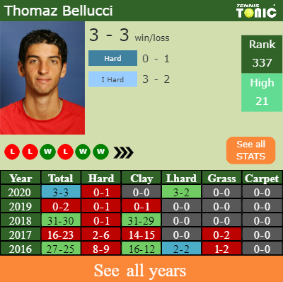 Bellucci has a winning record in the last 10 years having won 56% of his matches (97-77). 3-2 on indoor hard courts in 2020. Regarding his performance on the same surface of this competition, Bellucci has a 217-202 record in the last 10 years on indoor hard courts.