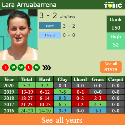 Arruabarrena-Vecino has a negative record in the last 10 years having won only 44% of her matches (425-544). 3-2 on hard in 2020. . Talking about her performance on the same surface of this tournament, Arruabarrena-Vecino has a 170-174 win-loss record in the last 10 years on hard.