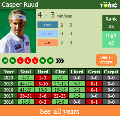 Ruud has a winning win-loss record in the last 6 years having won 59% of his matches (317-219). 2-0 on clay in 2020. In connection with his performance on the same surface of this tournament, Ruud has a 135-106 win-loss record in the last 6 years on clay.