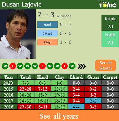 Dusan has a 7-3 win-loss record in 2020, 1-0 on clay (See FULL STATS).