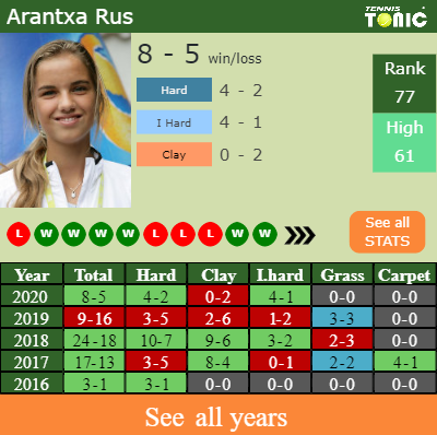 Rus has a unfavourable win-loss record in the last 10 years having won only 48% of her matches (210-230). 4-2 on hard in 2020. . Talking about her performance on the same surface of this tournament, Rus has a 103-119 win-loss record in the last 10 years on hard.