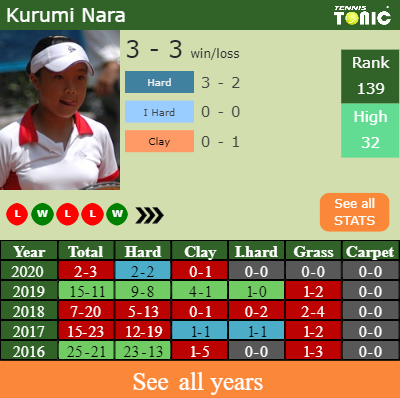 Nara has a 2-3 win-loss record in 2020, 2-2 on hard (See FULL STATS).