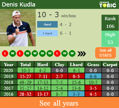 Kudla has a solid record in the last 10 years having won 65% of his matches (416-220). 6-1 on indoor hard courts in 2020. In connection with his performance on the same surface of this competition, Kudla has a 324-244 win-loss record in the last 10 years on indoor hard courts.