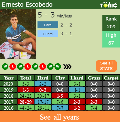 Escobedo has a winning record in the last 7 years having won 59% of his matches (55-39). 3-1 on indoor hard courts in 2020. In connection with his performance on the same surface of this competition, Escobedo has a 119-97 record in the last 7 years on indoor hard courts.