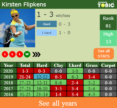 Talking about her overall career, Flipkens has an overall 290-264 record. She has positive 135-116 record on hard.