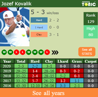 Kovalik has a 5-3 win-loss record in 2020, 3-1 on clay (See FULL STATS).