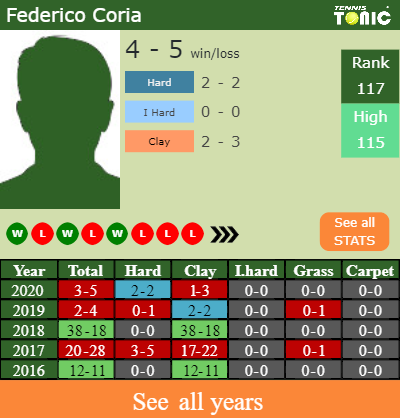 Coria has a 3-5 win-loss record in 2020, 1-3 on clay (See FULL STATS).