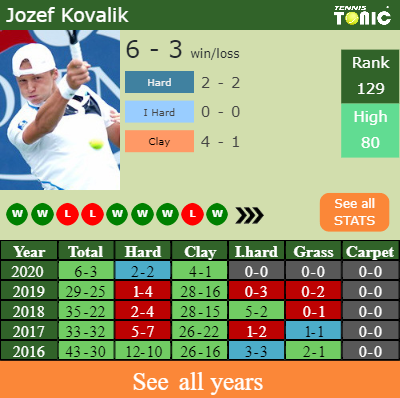 Kovalik has a solid win-loss record in the last 10 years having won 62% of his matches (1168-716). 4-1 on clay in 2020. Regarding his performance on the same surface of this competition, Kovalik has a 231-183 record in the last 10 years on clay.
