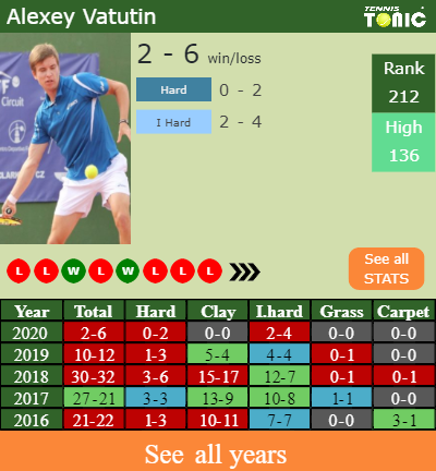 Vatutin has a 2-6 win-loss record in 2020, 2-4 on indoor hard courts (See FULL STATS).