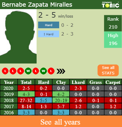 Zapata Miralles has a 2-5 win-loss record in 2020, 2-3 on indoor hard courts (See FULL STATS).
