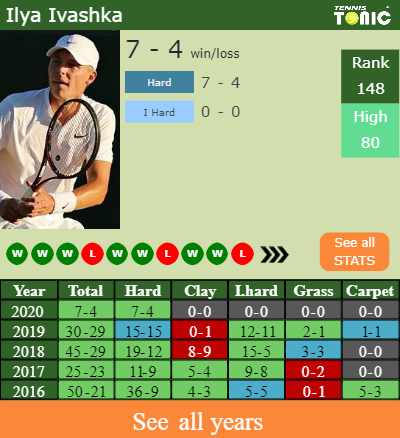 The Belarussian has a 7-4 win-loss record in 2020, 0-0 on indoor hard courts (See FULL STATS).